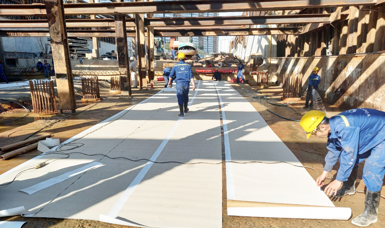 Cấu tạo lớp chống thấm bao gồm màng chống thấm gốc TPO dày 1.7mm bao bọc xung quanh bản đáy, tường và đỉnh hầm. Xen kẽ là tăng cường băng cản nước, cao su trương nở, keo trám khe, tấm dán gia cường các vị trí xung yếu như khe co giãn, mạch ngừng thi công tạo thành một hệ kín nước hoàn toàn tránh sự xâm nhập nước ngầm.