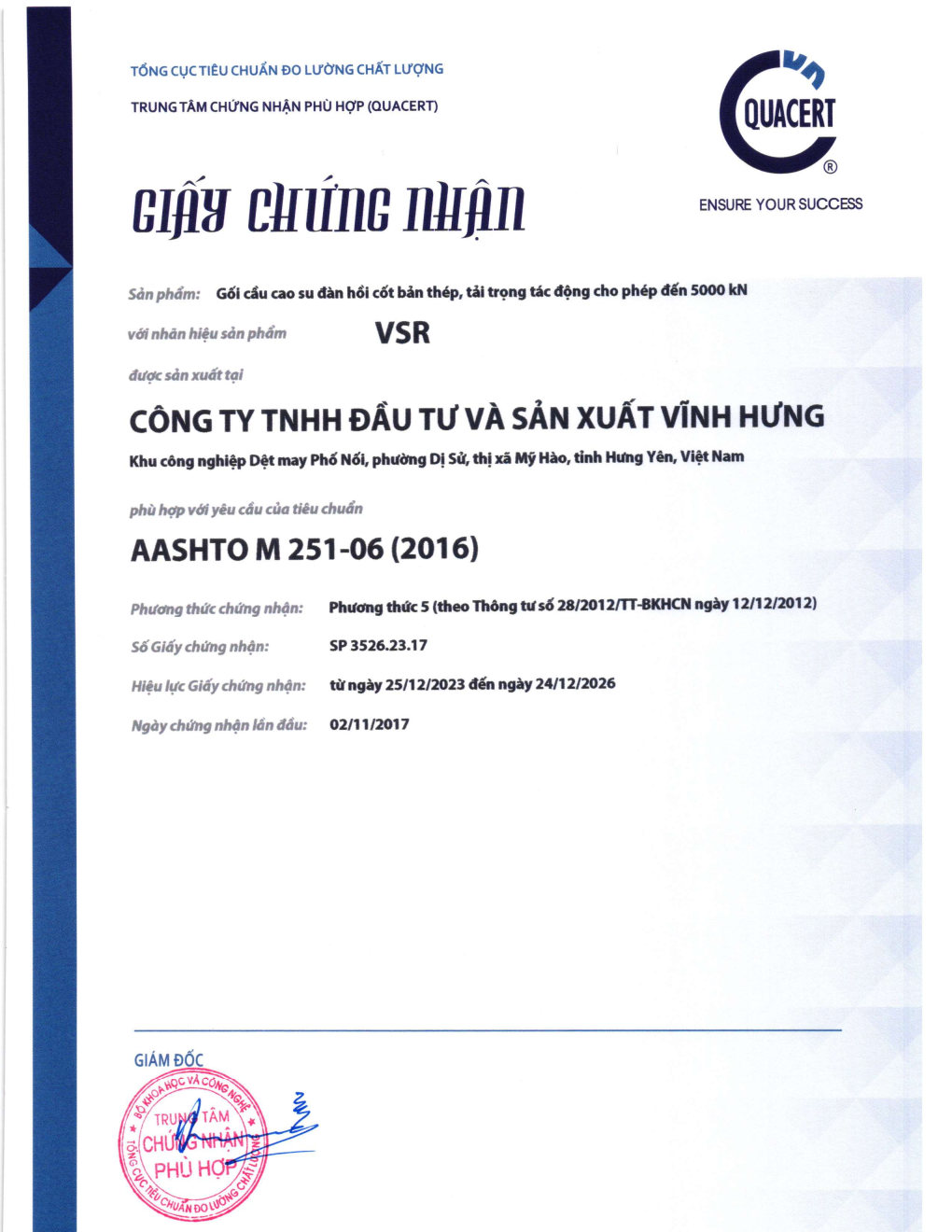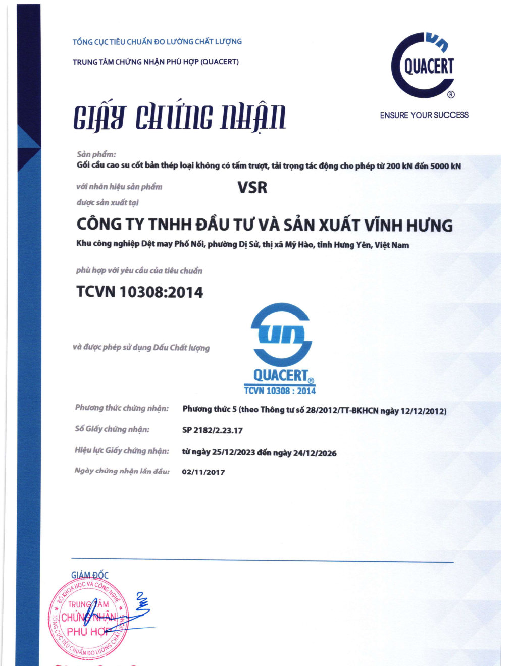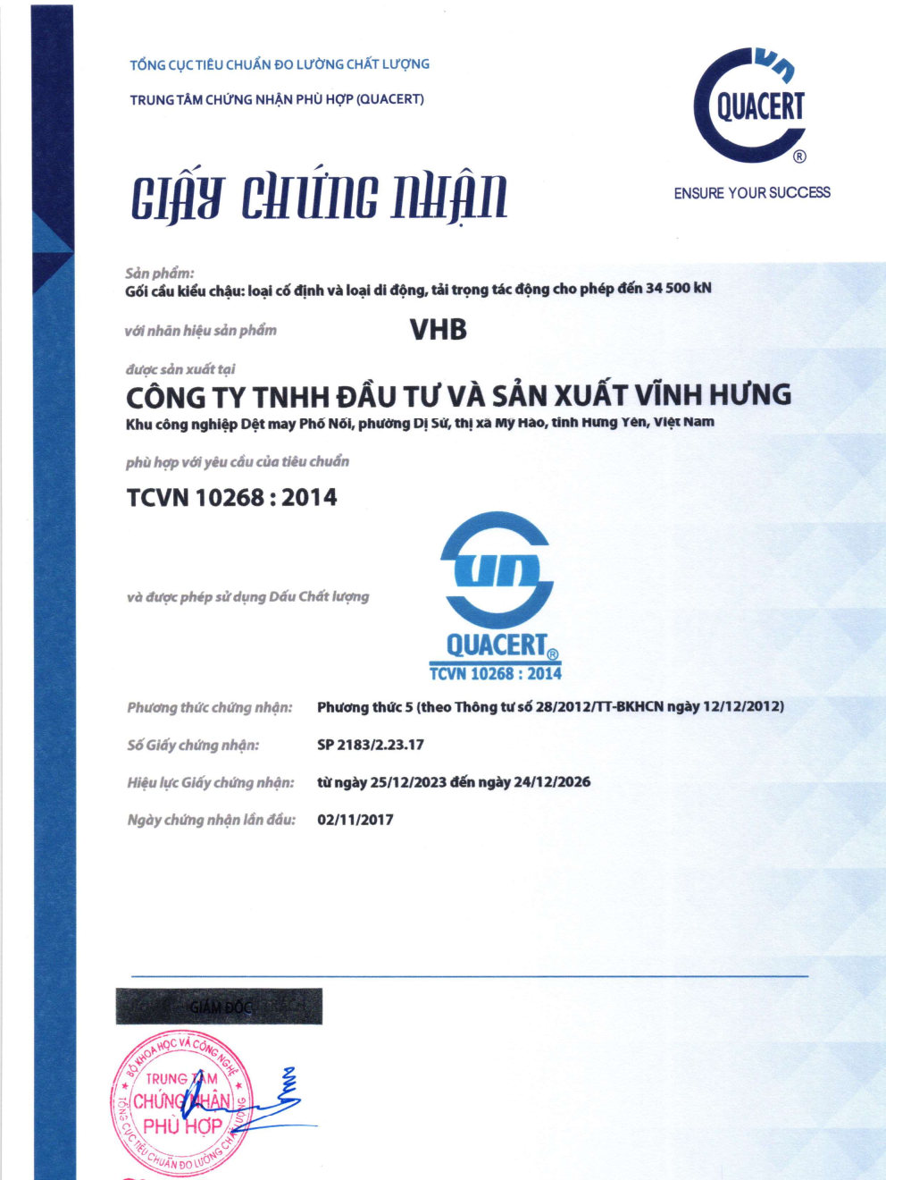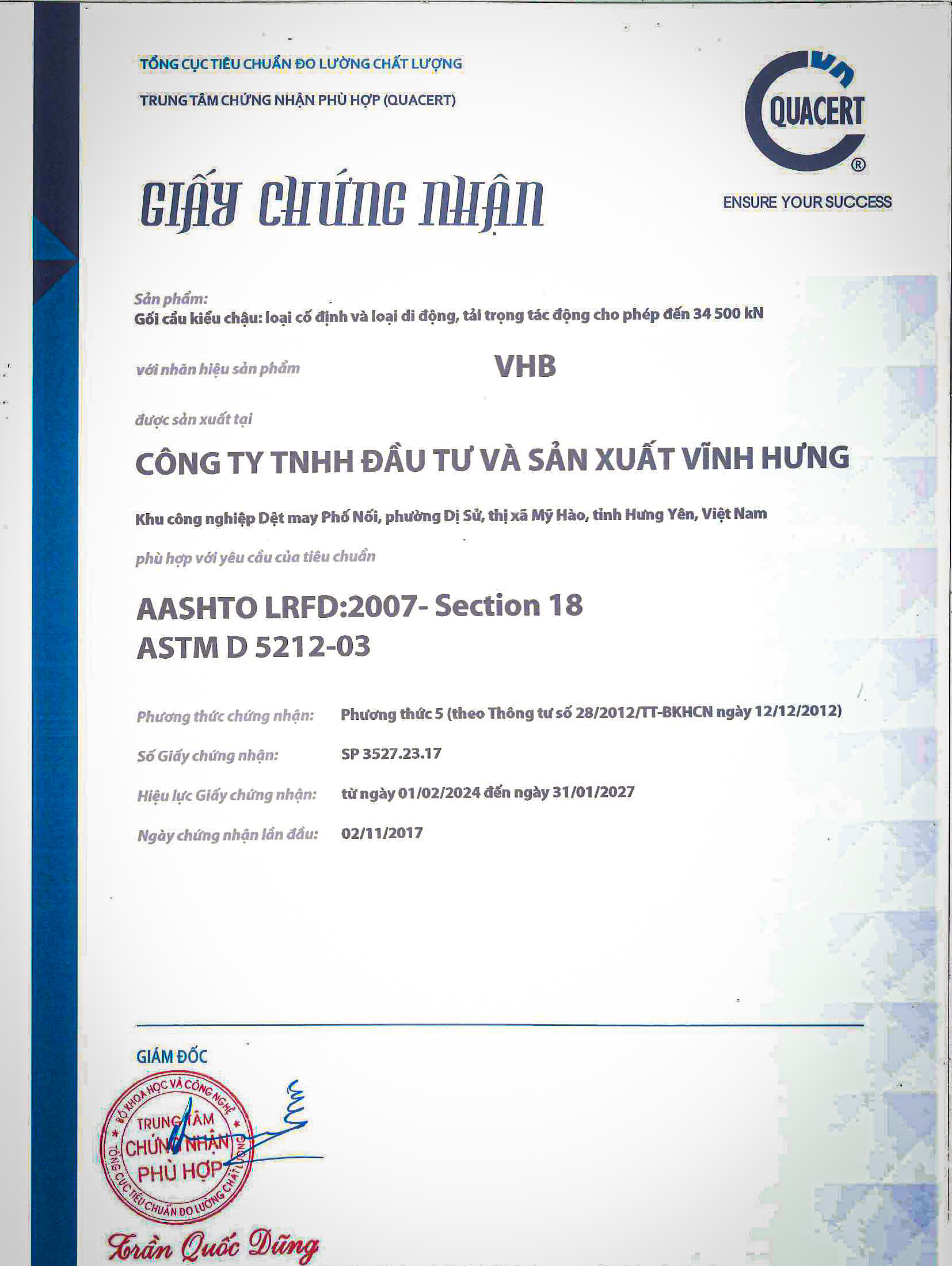 Giấy chứng nhận hợp chuẩn sản phẩm gối chậu, gối cao su do Vĩnh Hưng sản xuất: