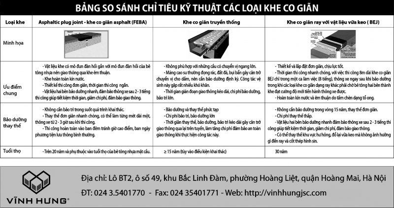 “Để thi công 8m khe co giãn BEJ chỉ cần trong một ca làm việc 8 tiếng và đảm bảo thông xe sau 2 -3 tiếng. Khe co giãn BEJ không cần bảo trì trong thời gian 15 năm đầu sử dụng. Chi phí thay thế thấp, dùng vữa keo để đổ lại tại vị trí bị hỏng mà không ảnh hưởng đến ray kim loại và cốt thép hình sin”, Vĩnh Hưng JSC thông tin và cho biết, khe co giãn BEJ có thể sử dụng cho cả dự án lắp đặt mới và bảo trì công trình cầu.