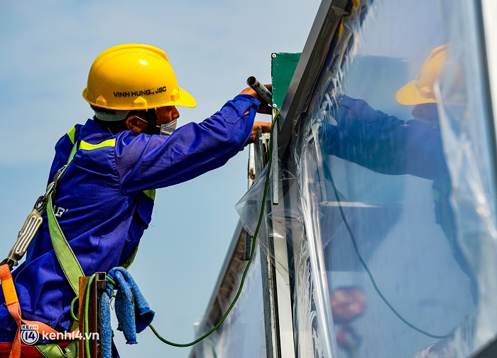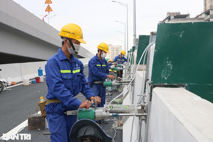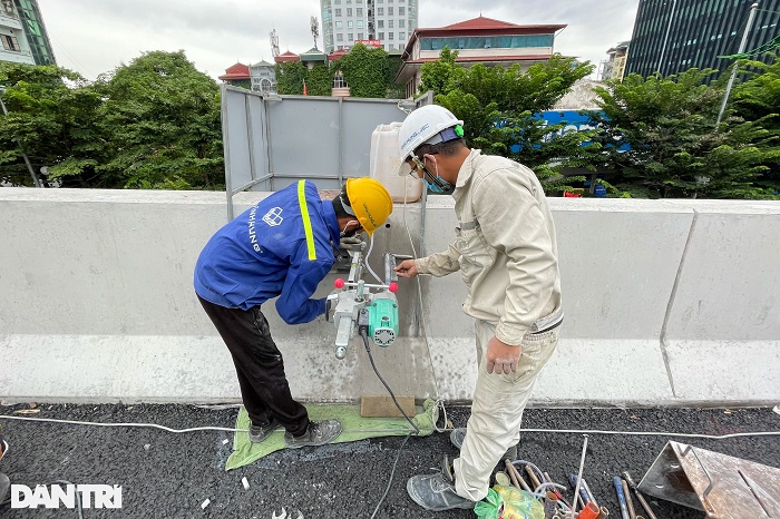 Trước đó, công nhân của nhà thầu Vĩnh Hưng đã tiến hành việc khoan bê tông để lắp đặt các cột thép phục vụ việc lắp vách chống ồn, trên đoạn lối lên xuống đường vành đai 3 trên cao. Tại mỗi điểm khoan, Vĩnh Hưng sẽ bố trí khoảng 2 người, trong đó một người sẽ làm nhiệm vụ dùng các tấm mút để lau sạch nước từ điểm khoan, tránh mất vệ sinh tại khu vực thi công.