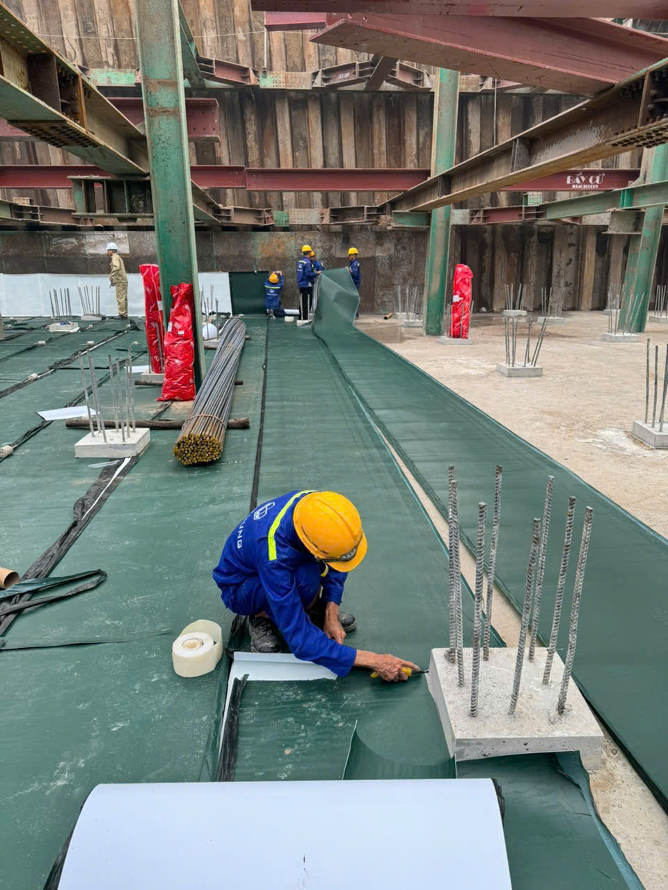 - Lớp chống thấm loại 1: Màng HDPE trải trước dính bám hoàn toàn với bê tông, khi đổ bê tông được trải khắp đáy của hầm.