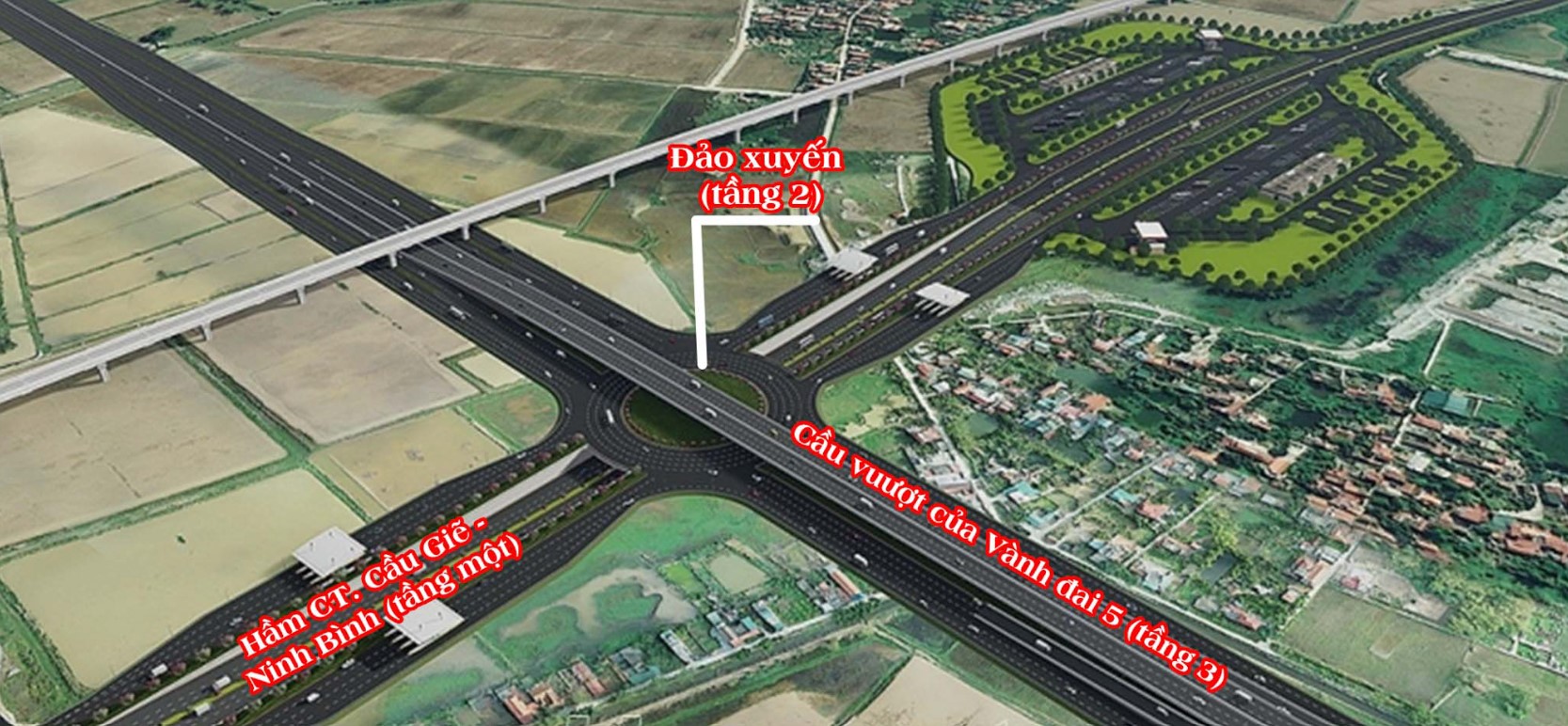 - Tầng 2 xây dựng đảo xuyến R=40m, 4 nhánh ra, vào cao tốc để kết nối cao tốc Cầu Giẽ - Ninh Bình với đường bên vành đai 5 phục vụ giao thông địa phương.