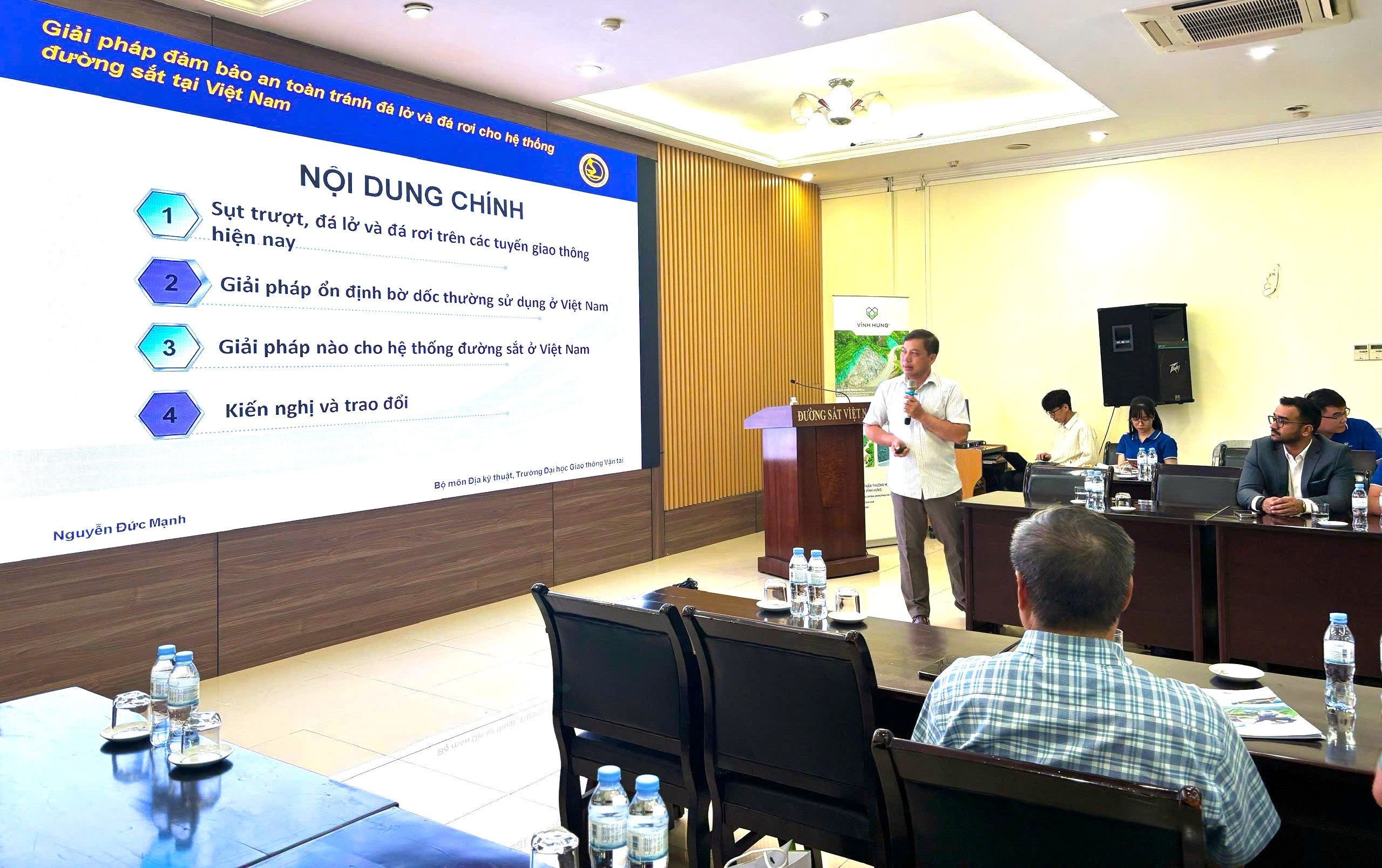 Đại diện Vĩnh Hưng, ông Nguyễn Huy Chung – Phó phòng Kỹ thuật & Nghiên cứu phát triển, công ty Cổ phần Thương mại, Tư vấn và Xây dựng Vĩnh Hưng – đã trình bày tham luận về “Ứng dụng giải pháp kết cấu lưới thép trong phòng chống đá lở, chống xói bề mặt và ổn định bờ dốc cho hệ thống đường sắt quốc gia”. Theo ông Chung, hiện tượng đá lở, đá rơi chủ yếu xuất phát từ ba nhóm nguyên nhân: kết cấu địa tầng (đá nứt nẻ, nước ngầm…), tác động môi trường (mưa, gió, động vật đào hang…), và yếu tố con người (thi công nổ phá kém, rung động từ phương tiện, thiết kế mái dốc chưa hợp lý).