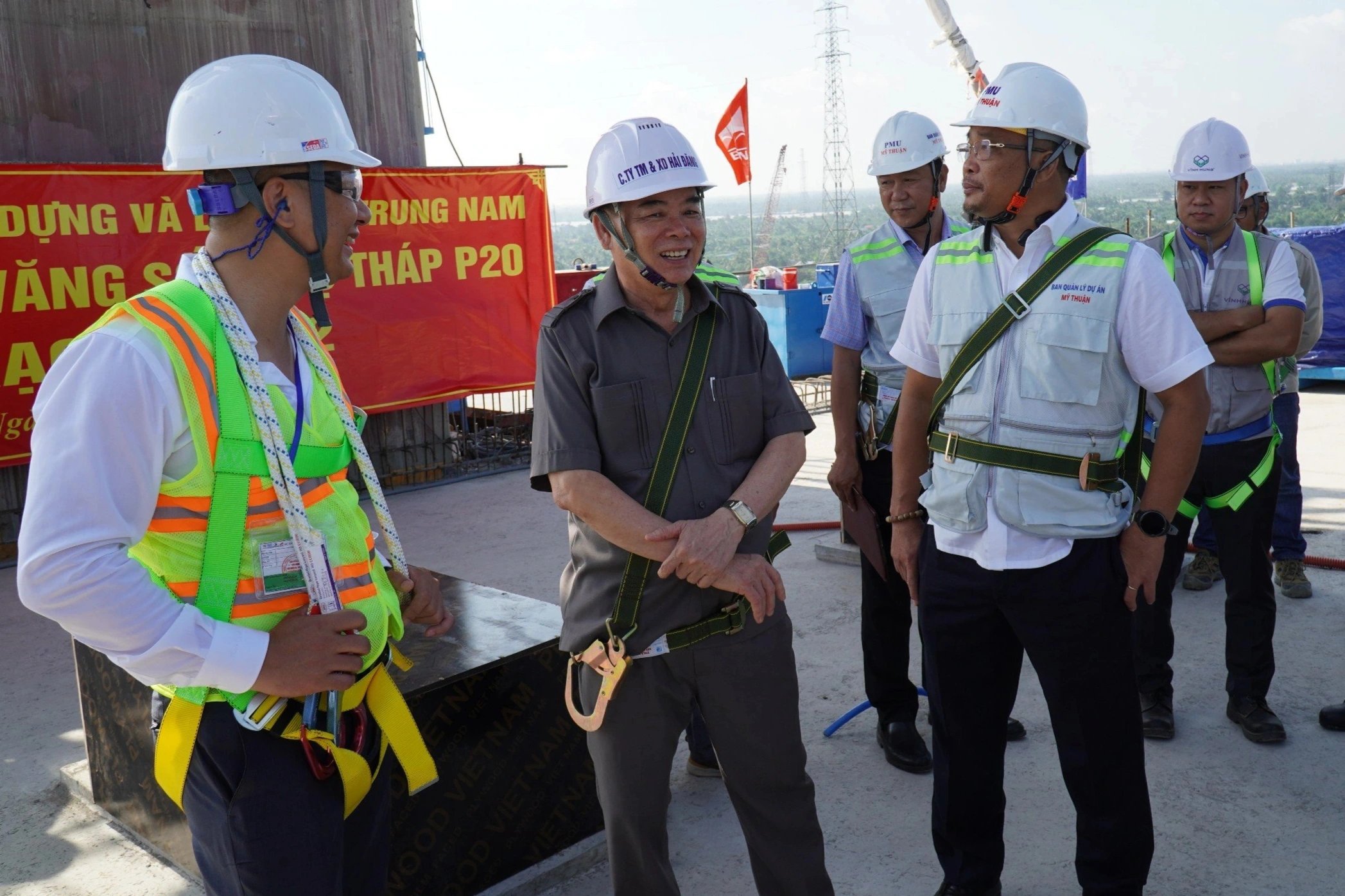 Chủ tịch UBND tỉnh Bến Tre Trần Ngọc Tam (áo sẫm màu) đến dự sự kiện căng bó cáp đầu tiên ở dự án cầu Rạch Miễu 2
