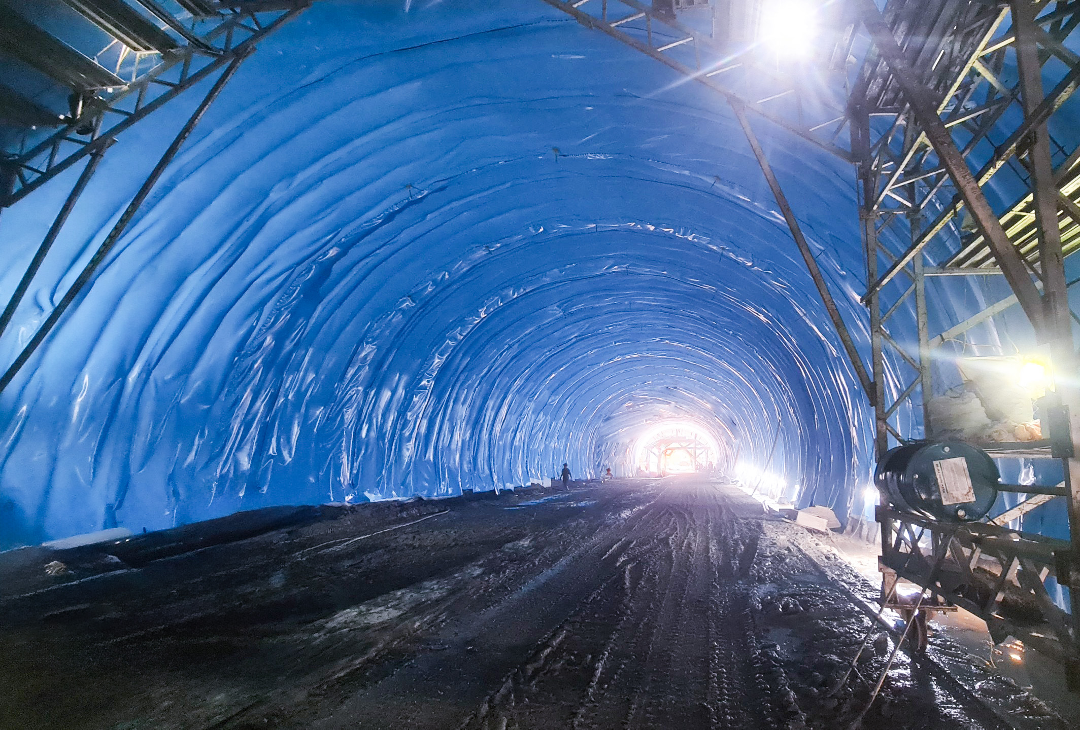 Chống thấm hầm được lắp đặt giữa lớp bê tông phun và bê tông vỏ hầm, bao gồm hai lớp: Lớp ngoài là vải địa kỹ thuật không dệt, lớp trong là màng chống thấm.