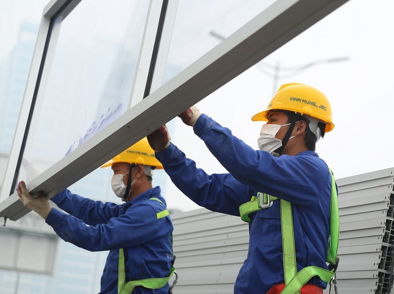 Công nhân của Vĩnh Hưng JSC thi công lắp đặt vách chống ồn tại dự án Vành đai 3 trên cao đoạn Mai Dịch - Nam Thăng Long