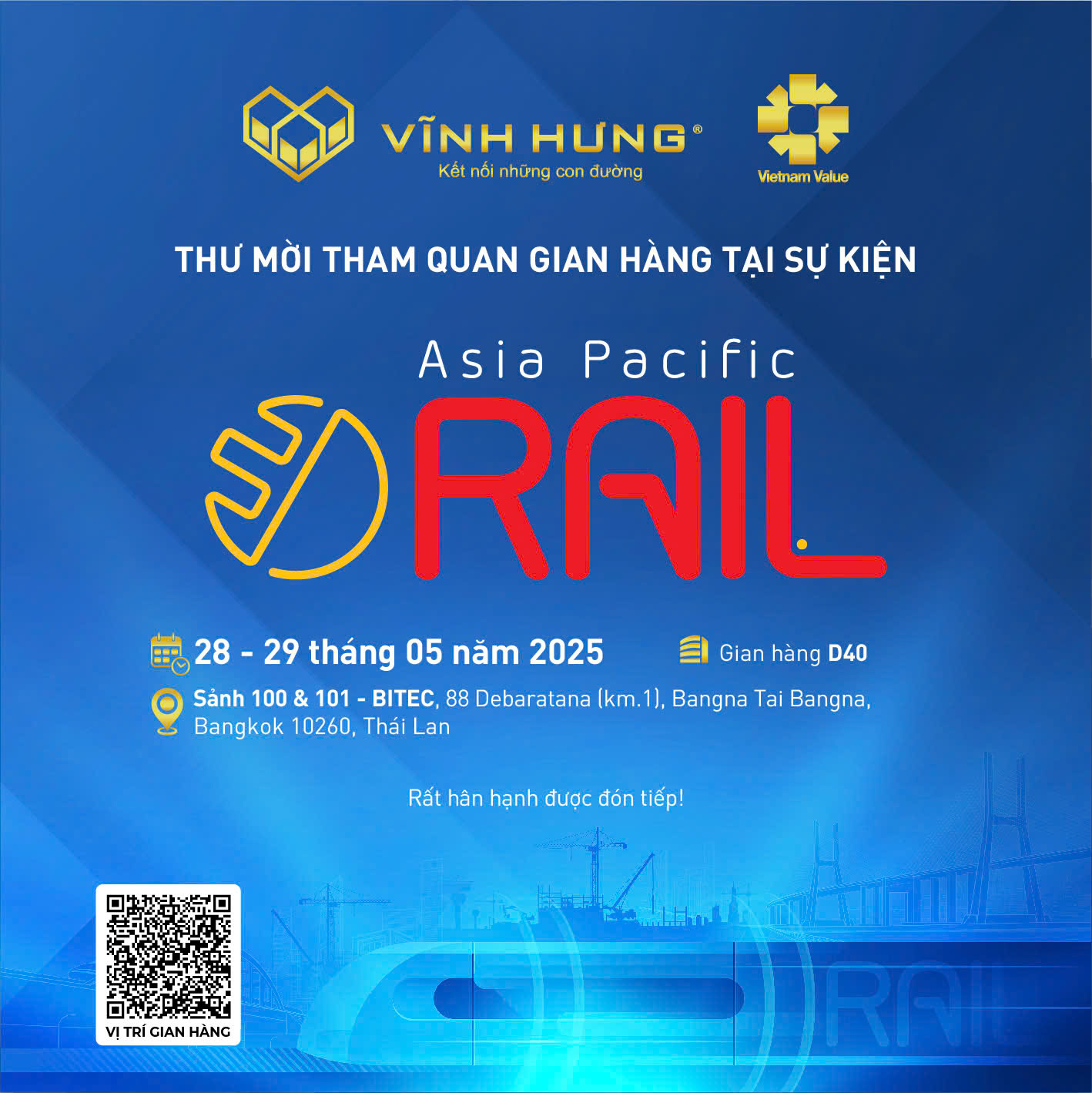 Chúng tôi trân trọng kính mời Quý vị tới tham quan triển lãm và gian trưng bày của Vĩnh Hưng, cùng khám phá các sản phẩm và trao đổi những giải pháp mới cho giao thông đường sắt, kết nối cơ hội hợp tác trong tương lai.