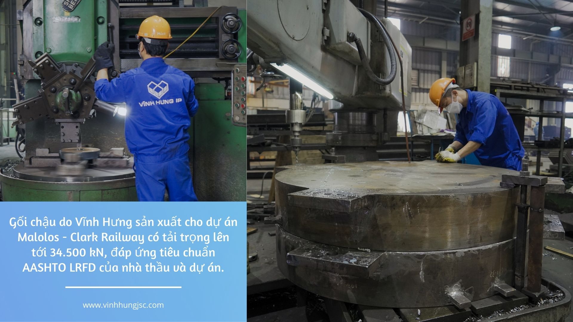 Vừa qua, Vĩnh Hưng tiếp tục trở thành doanh nghiệp Việt Nam đầu tiên sản xuất và xuất khẩu loại Gối chậu chịu được tải trọng tối đa lên tới 34.500kN sang thị trường Philippines cho dự án MRT Malolos-Clark Railway. Đây là loại gối chịu tải trọng cao thường được sử dụng trong các công trình cầu đường tầm cỡ, được thiết kế và sản xuất theo tiêu chuẩn AASHTO LRFD của Hoa Kỳ với yêu cầu khắt khe về năng lực kỹ thuật, máy móc cũng như tay nghề.