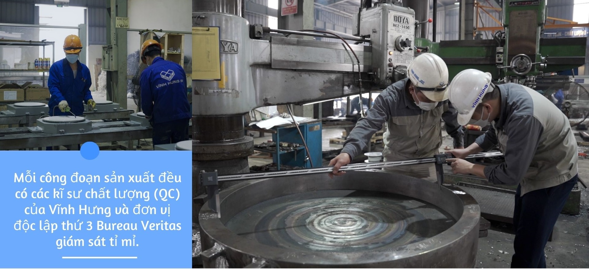 Bên cạnh đó, để nhà thầu có thể theo dõi, giám sát các công đoạn sản xuất gối cầu, yên tâm về chất lượng sản phẩm, Vĩnh Hưng đã phối hợp với nhà thầu làm việc cùng bên thứ 3 - Bureau Veritas đến chứng kiến, thử nghiệm và chứng nhận chất lượng trong từng công đoạn.